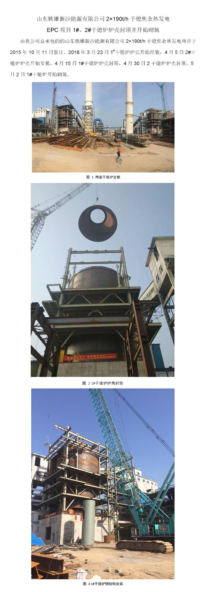 山东铁雄干熄焦 EPC 项目1#、2#干熄炉炉壳封顶并开始砌筑